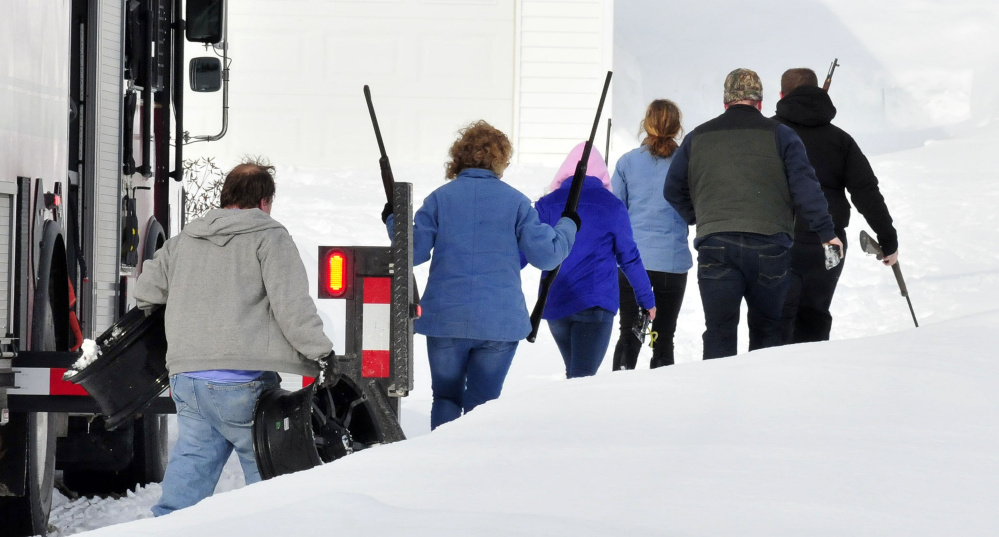 People carry several firearms that were salvaged Thursday from an Ohio Hill Road residence in Fairfield that was destroyed by fire. The man at left is carrying specialty tire rims, according to a firefighter. The home and most of the contents were destroyed. Staff photo by David Leaming