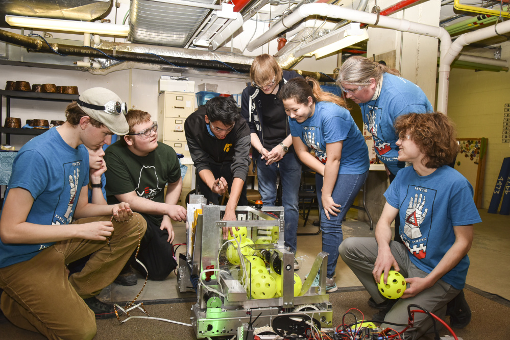 Giles’ son graduated last year after serving as one of the team leaders during the competition season, but she said she decided to stick around as lead mentor because she loves working with the students and seeing how their minds work. Giles, an artist and former therapeutic horse riding instructor, has made robotics her career as director of the Robotics Institute of Maine, whose mission is to inspire youth to gain a new perspective on science and technology by providing opportunities and resources for robotics programs.