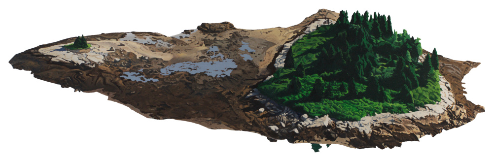 The shadows do great things with objects like a seagull tethered by its shadow to the spatially vague but very real white wall. A particularly tall and slender form – a sliver of an elevated highway seen from below – like half a teardrop is a fine shape, but its night-lit shadow renders it gorgeously elegant. Particularly witty are Cady’s islands – slivers of land with brushy stands of trees. They use the white walls like a vision poking through thick morning fog. Cady’s works reach up the soaring walls with gymnastic grace, but they also hold the ground with playful wit: A spidery fishing pole with its bit-red flag waits for a tug and a green pillow back beckons snarkily. This flat shaped-canvas pillow is free-standing away from the wall – a neurotic curator’s nightmare. It’s hilarious.