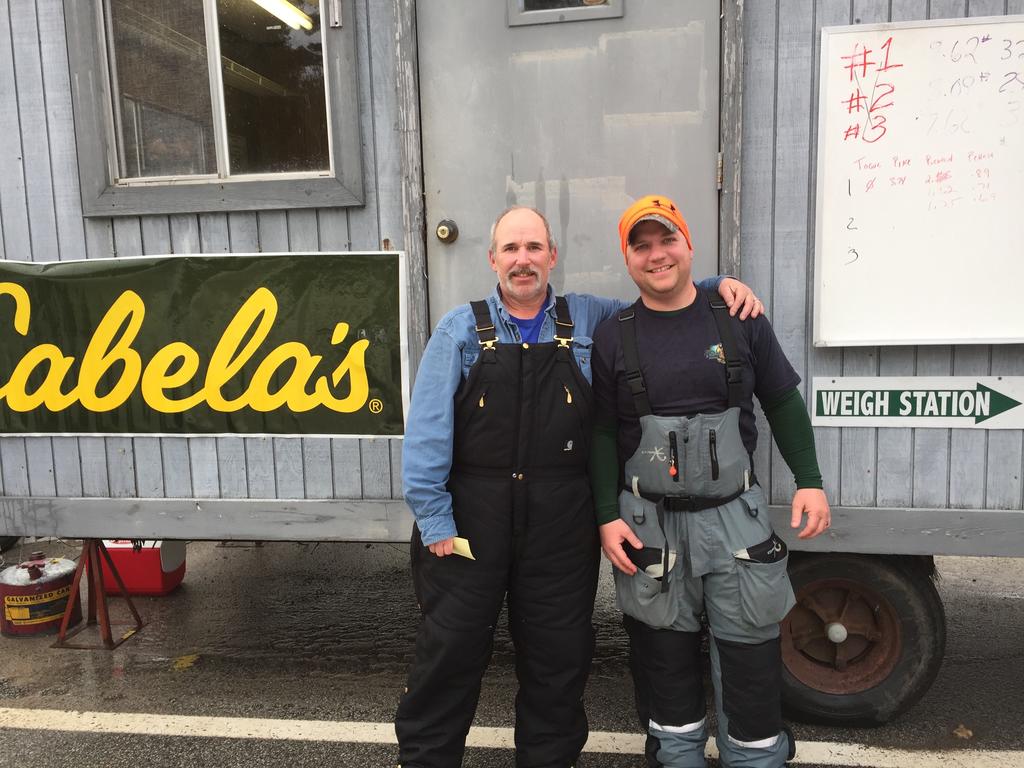 Troy Holston, of Windham, and Kurt Kiley of New Hampshire, at the Sebago Lake Station Landing fish weigh station. They fished on Saturday at Highland Lake in Windham.