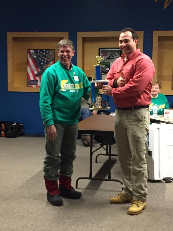 Jonathan Koperniak, of Cumberland, accepts his trophy for catching the largest togue during the Sebago Lakes Rotary Ice Fishing Derbies this past weekend. Koperniak caught the 4.44 pound fish on Thompson Lake.