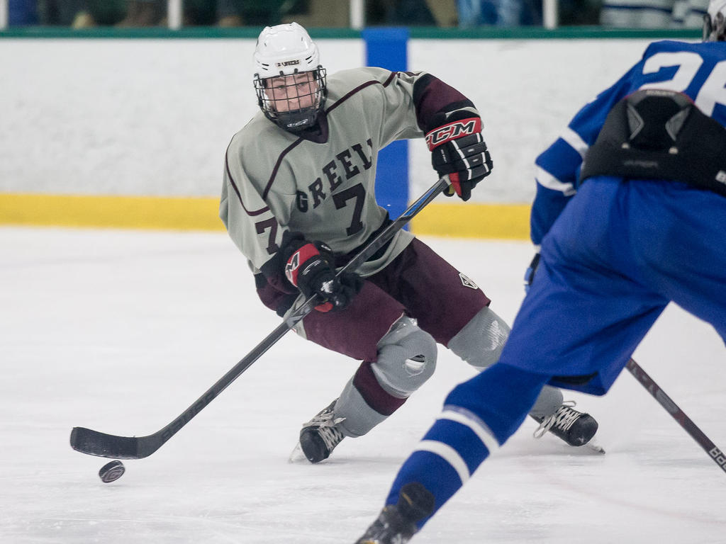 Greely freshman Andy Moore handles the puck.