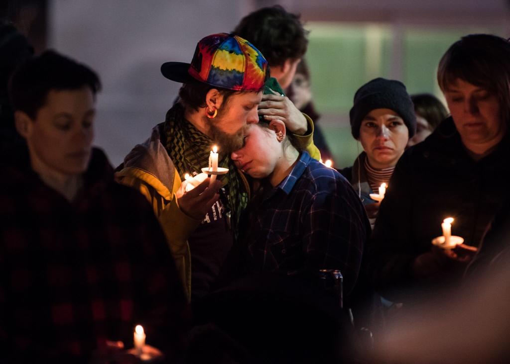 Friends of Chance David Baker mourn during a Feb. 24 vigil in Portland’s Monument Square. Baker was killed by police Feb. 18; his death has prompted renewed calls for equipping police with body cameras. (Dan D’Ippolito / For The Forecaster)