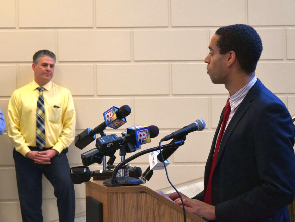 Councilor Spencer Thibodeau organized the Feb. 22 City Hall press conference to support a pilot program.