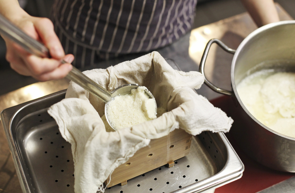 Poulos assembles her wooden tofu mold – she bought it on Amazon – and places it in a perforated pan. She lines the mold with a scallop bag, wets the cloth with some of the whey and starts ladling in the curds and whey. The whey drips through holes in the side of the mold and a slit in the bottom, then through the perforated pan.