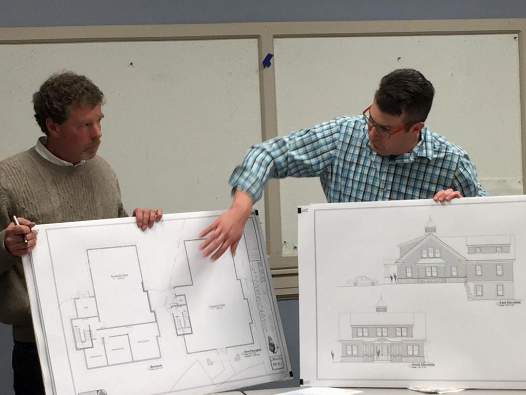 Engineer Jim Fisher, left, and architect Chris Bakkila review designs in a March 7 Planning Board workshop for two medical office buildings proposed for the former Cumberland Farms property on Route 77 in Cape Elizabeth.