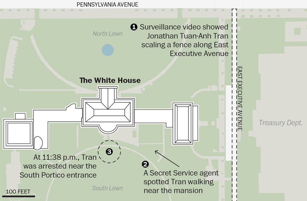 Surveillance video showed Tran scaling a fence near the Treasury Building on East Executive Avenue. He was arrested about 11:38 p.m. According to the criminal complaint, Tran told the arresting officer: “I am a friend of the president. I have an appointment.”