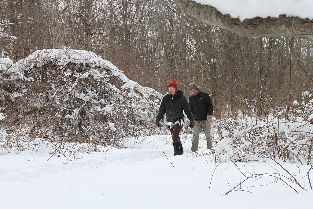 Jacque Kutvirt and Louie Reimensnyder, both of South Portland, enjoy a walk in the fresh snow on Wednesday at Hinckley Park in South Portland. (Melanie Sochan / The Forecaster)
