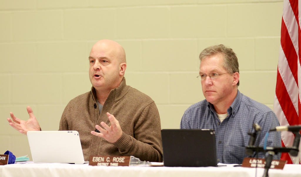 South Portland City Councilors Claude Morgan, left, and Eben Rose on Monday, March 13, at a workshop on renter protections. Morgan said he would not support rent control.