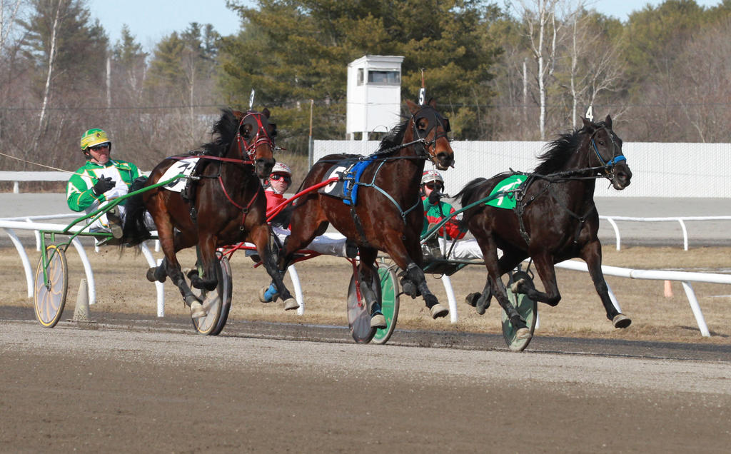 Racing in the seventh race on March 26 at Scarborough Downs are Namesmuscle, driven by Mark Athearn, left; Victory Tax, with driver Eddie Davis Jr., and Mack’s Gold Band, driven by Gary Mosher. Namesmuscle, owned by William H. Phipps of Yarmouth, won the race.