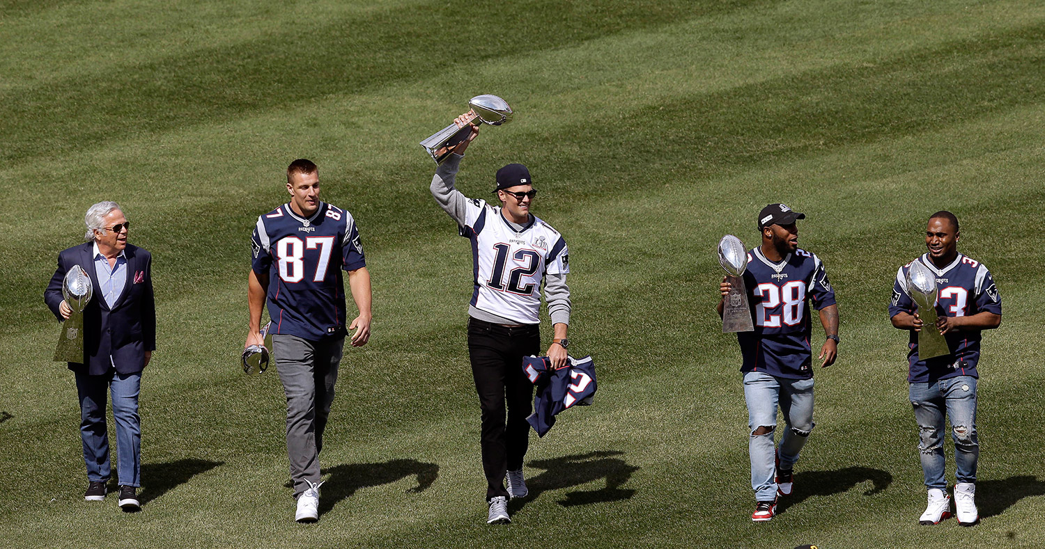 New England Patriots owner Robert Kraft, and players Rob Gronkowski, Tom Brady, James White and Dion Lewis display the team’s five Super Bowl trophies before the Red Sox opening day game.