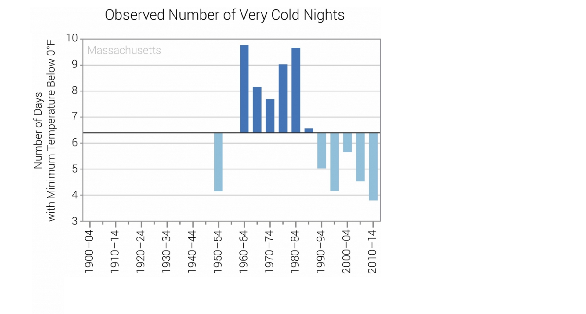 The trend is clear. While the climate continues to warm, winters are warming the fastest.  The chart below shows how temperatures in the Northeast have changed in the December-to-March period over the past decades.