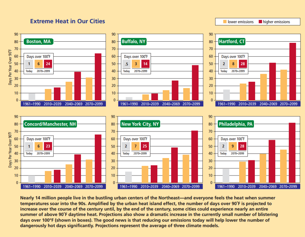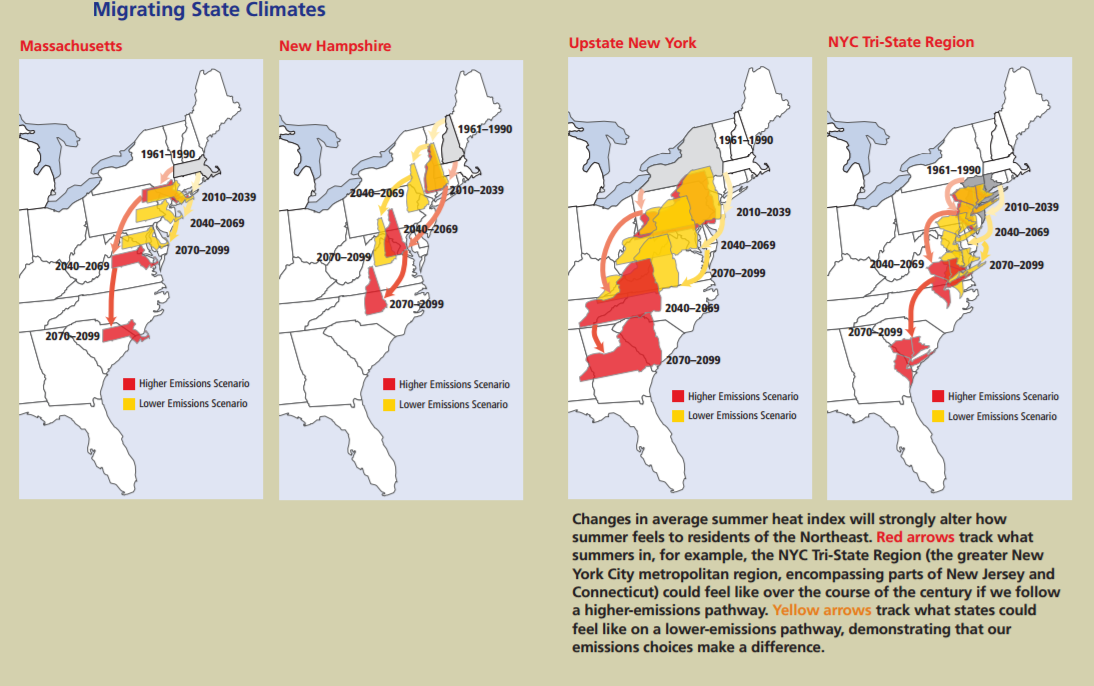 Even in the best-case scenario, by the end of the century much of New England’s weather will be more like Washington, D.C., and could be as warm as South Carolina.  Maine will likely see the least warming of the New England states, but not insignificantly.
