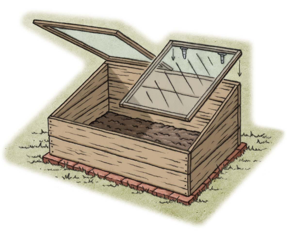 Make cold frames from scrap lumber scavenged, recycled or found around the house. Old window sashes, for example, can be turned into lids to hinge on to the cold frame. Or buy the materials – they aren’t costly.