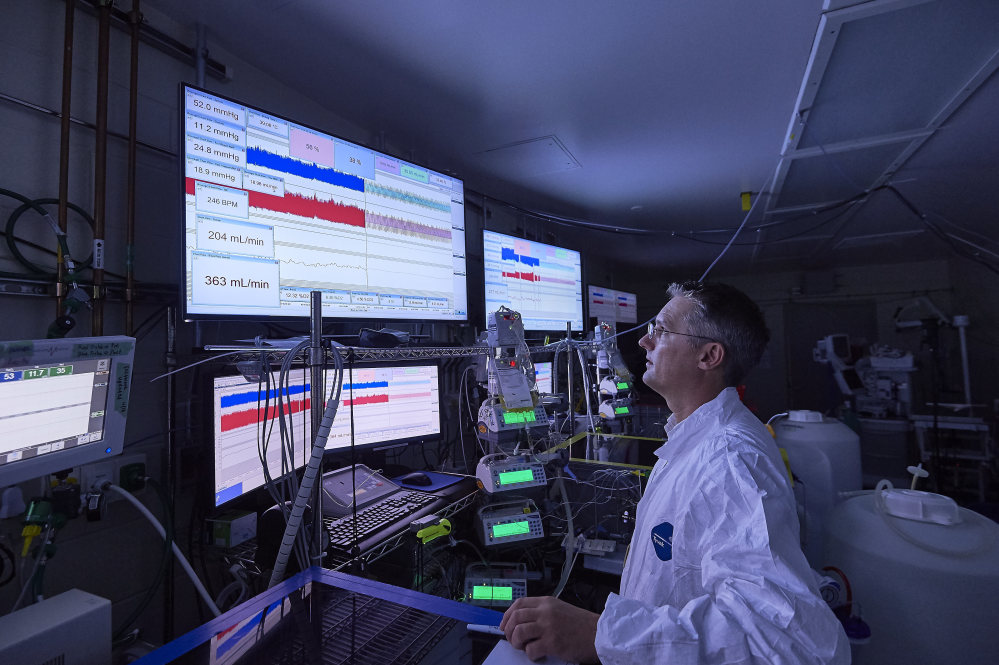 The researchers created a fluid-filled transparent container to simulate how fetuses float in amniotic fluid inside mom’s uterus, and attached it to a mechanical placenta that keeps blood oxygenated.