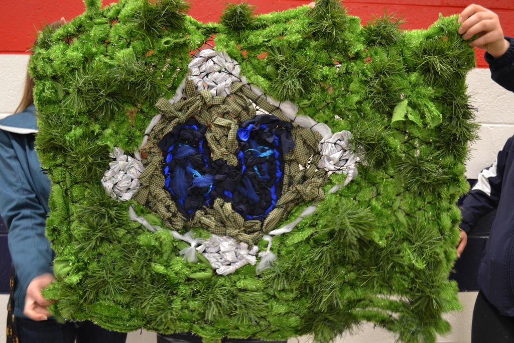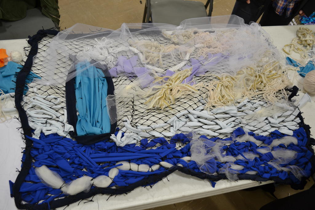 The students divided into 15 teams, each with a large piece of netting through which they could weave fabrics to create their sculptures. They were given a wealth of assorted materials to work with: rope fibers, yarn, fuzzy fabrics and even cut-up sweaters.