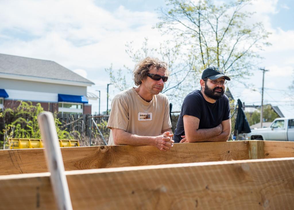 Will Zinn and Rob Korobkin watch the Portland Recovery Community Garden come to life May in North Deering. Zinn owns the land, Korobkin suggested the garden.