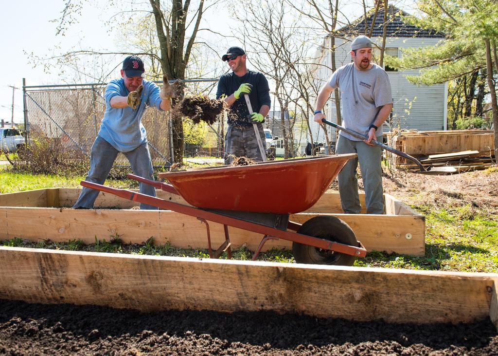 Brian Hall, left, Sean Jenkins and Cecil Solaguren, residents of Ocean House, a sober living home in Portland, prepare a planter box May 7 at a new community garden in North Deering.