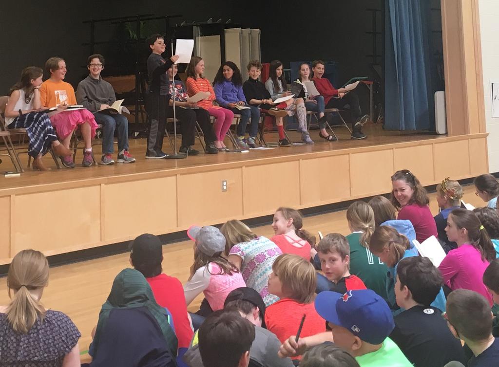 Riley Jackson, a fifth-grader at Harriet Beecher Stowe Elementary in Brunswick, reads a story he wrote working with teachers from The Telling Room, a Portland-based youth writing studio. The Telling Room published an anthology of work written by the entire fifth-grade class, which gathered in the gym May 12 to celebrate their achievement.