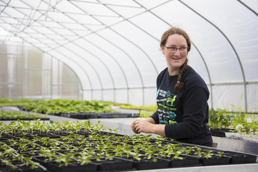 Alyssa Dolan transplants sunflower seedlings at Pearson’s Town Farm in Standish to prepare for seedling sales this weekend and next. Dolan, a former work-study student at the farm, was named assistant manager in 2015.
