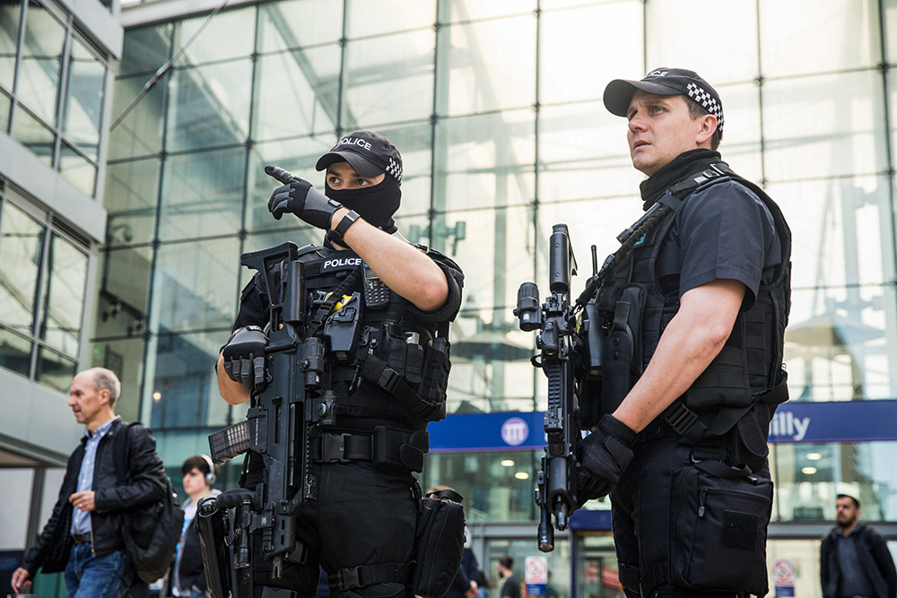 Police stand guard at Manchester Piccadilly railway station in Manchester, England, Tuesday.