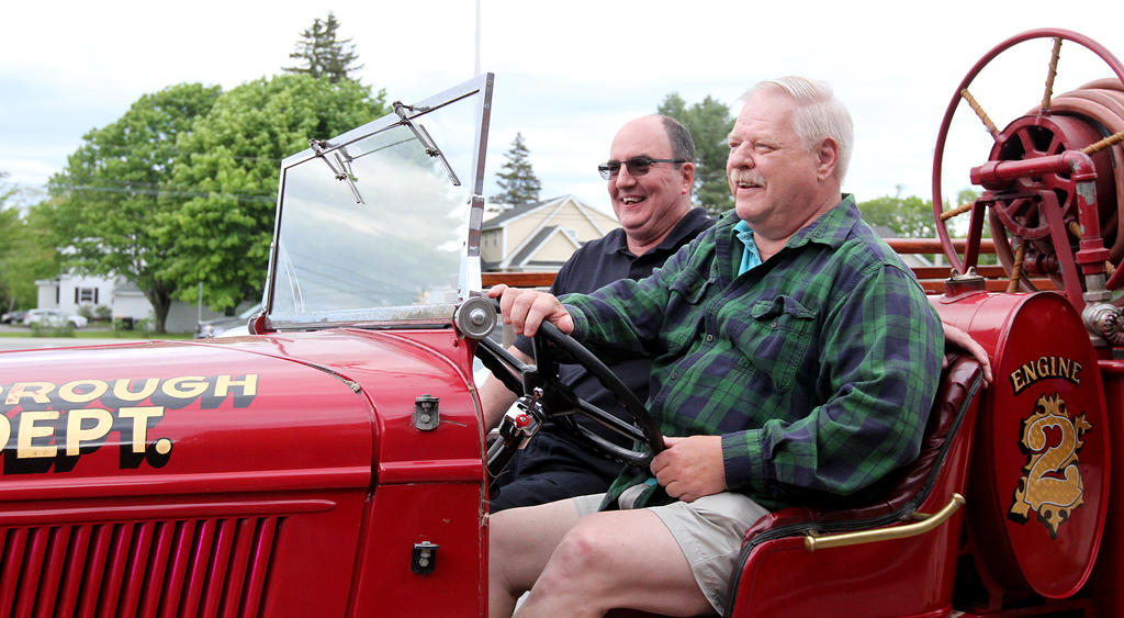 Eric Berry, right, who retired June 2 after working as a dispatcher for more than 35 years, drove home in the Scarborough Fire Department’s 1937 Ford Seagrave antique fire truck after his last day on the job.