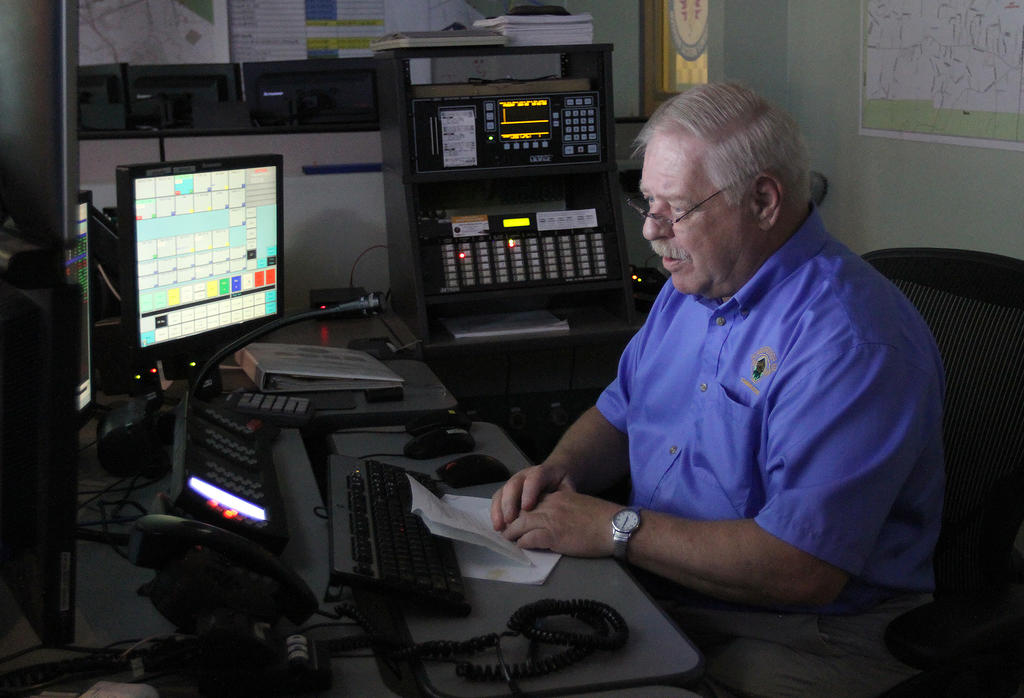 Eric Berry says his goodbyes during the 6 p.m. radio test June 2, his last day with the Scarborough Fire Department. Berry was a public safety dispatcher in Scarborough for more than 35 years.