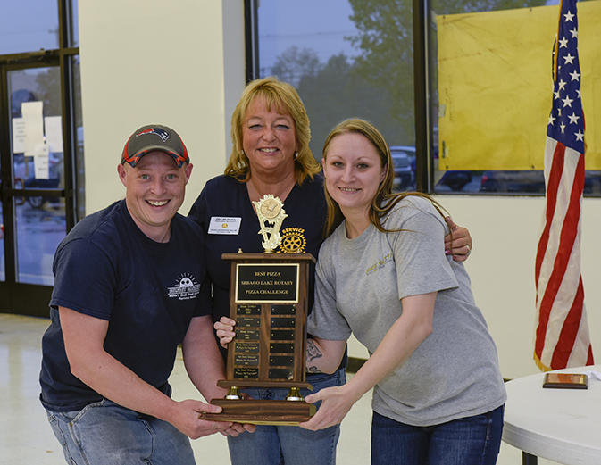 Danny Warren and Jen Weiss of Sunset Variety in Raymond accept the Sebago Lake Rotary Pizza Challenge People’s Choice award from Rotarian Deb McPhail, center.