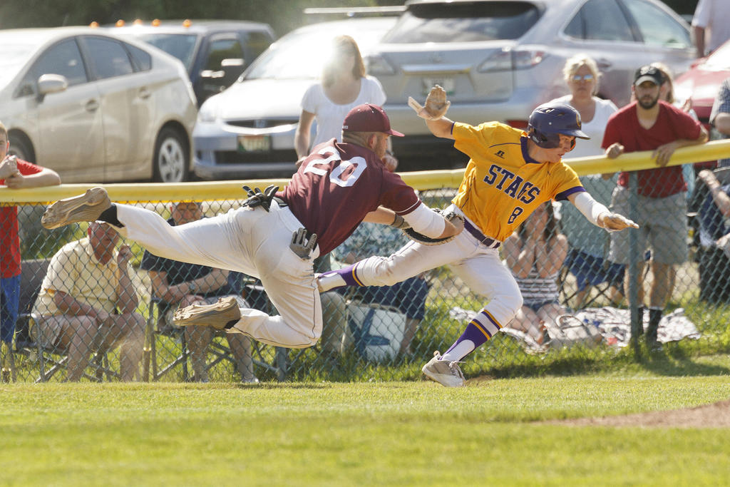 Griffin Watson dives back to first for the Stags vs. Gorham.