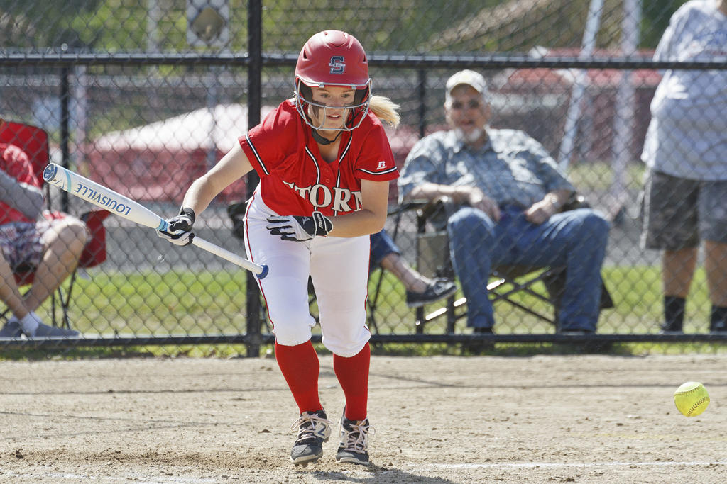 Bella Dickinso lays down a bunt for the Storm vs. Gorham.