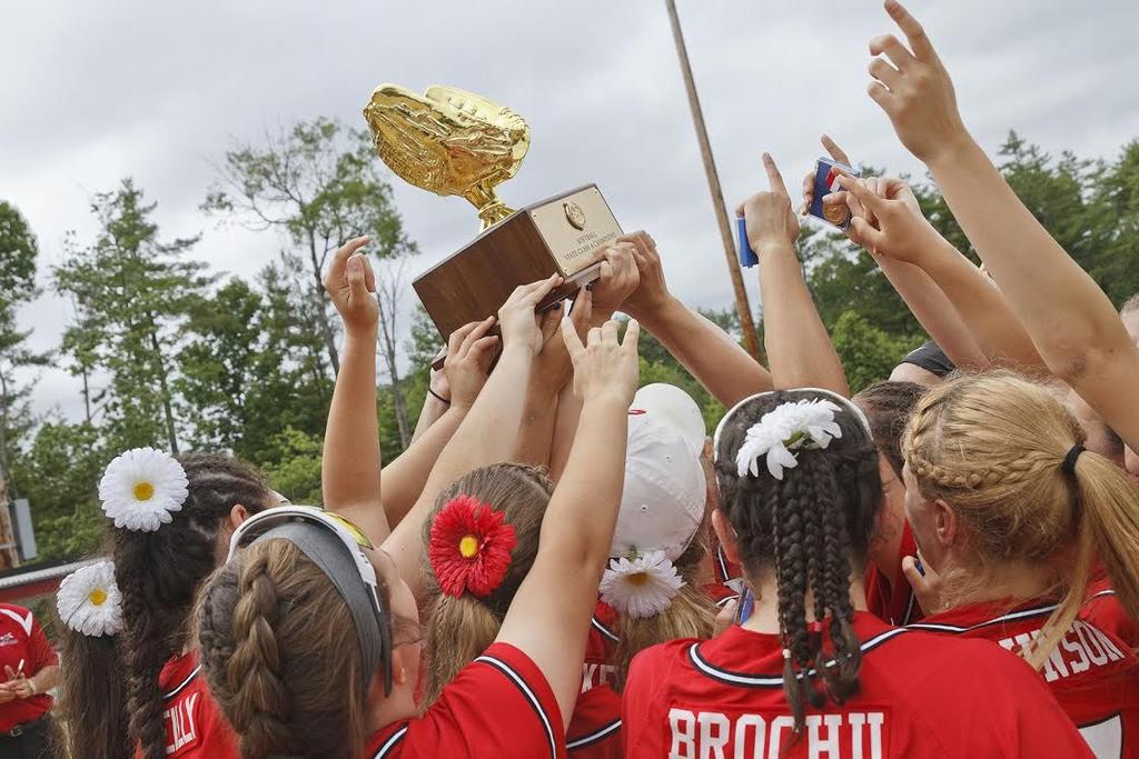 Scarborough’s softball team raises the trophy to the heavens after the victory, the program’s first state title since 2013.