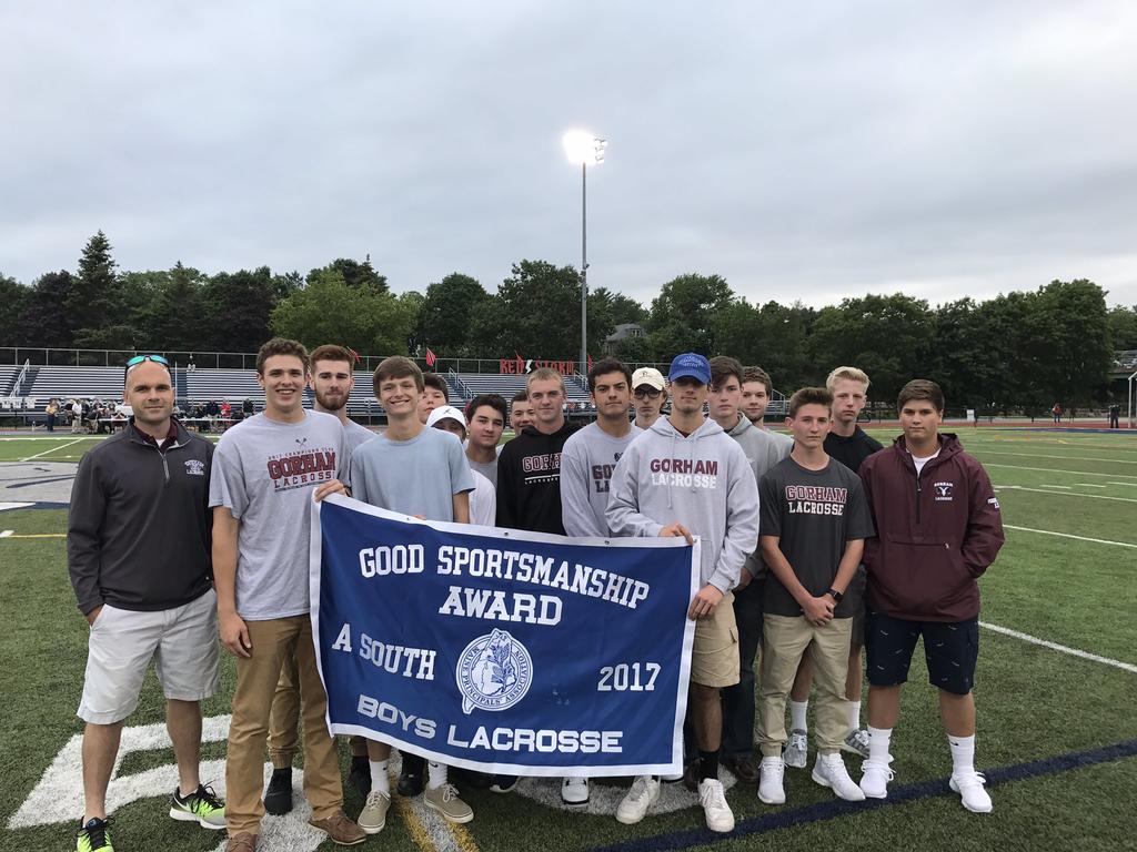 Members of the Gorham boys lax squad pose with their MPA Sportsmanship banner during halftime of the Class A State Final.