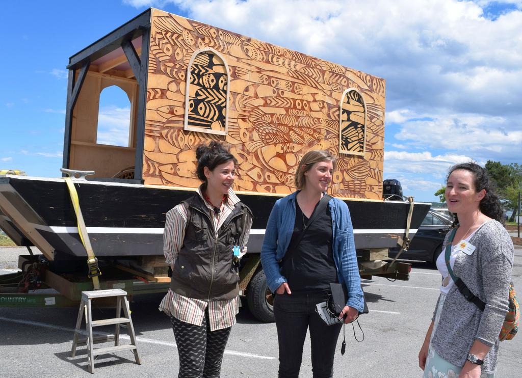 Emily du Houx, left, and Morgan Rogers will float the Michi Zeebee down the Mississippi River this summer. They were joined in Portland June 28 by Brittany Angelo, right, of Revision Energy, which is providing solar panels for the vessel.