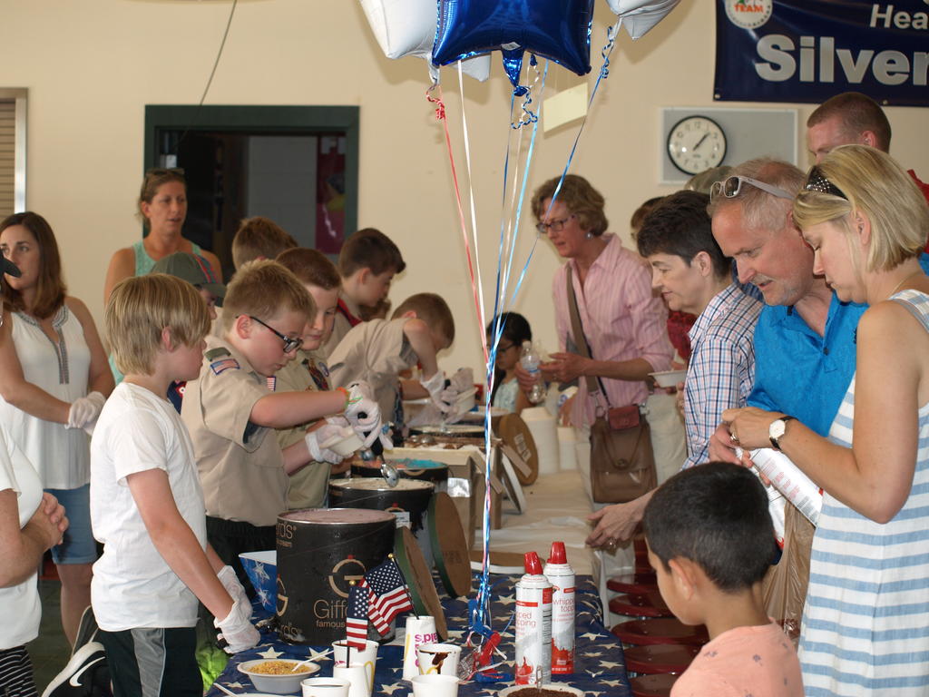 Members of Raymond Boy Scout Troop 800 scoop up ice cream at a community social to celebrate the Maine National Guard’s work on Raymond Elementary School’s safe and fun playground.