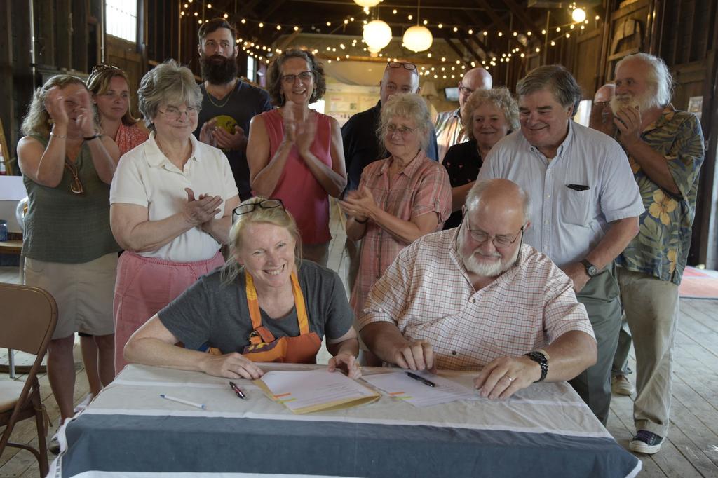 Surrounded by members of their respective boards of directors, Wiebke Theodore, left, president of the Bath Freight Shed Alliance, and Maine’s First Ship President Orman Hines sign documents July 9 for the merger of their organizations.