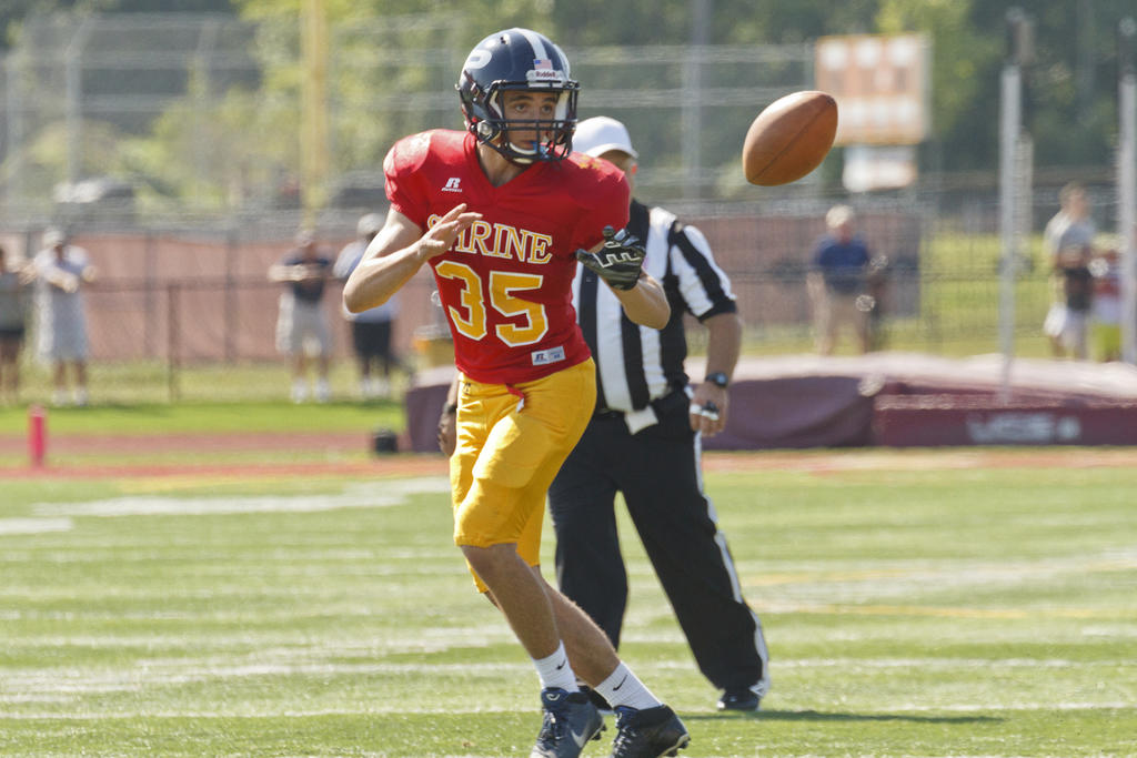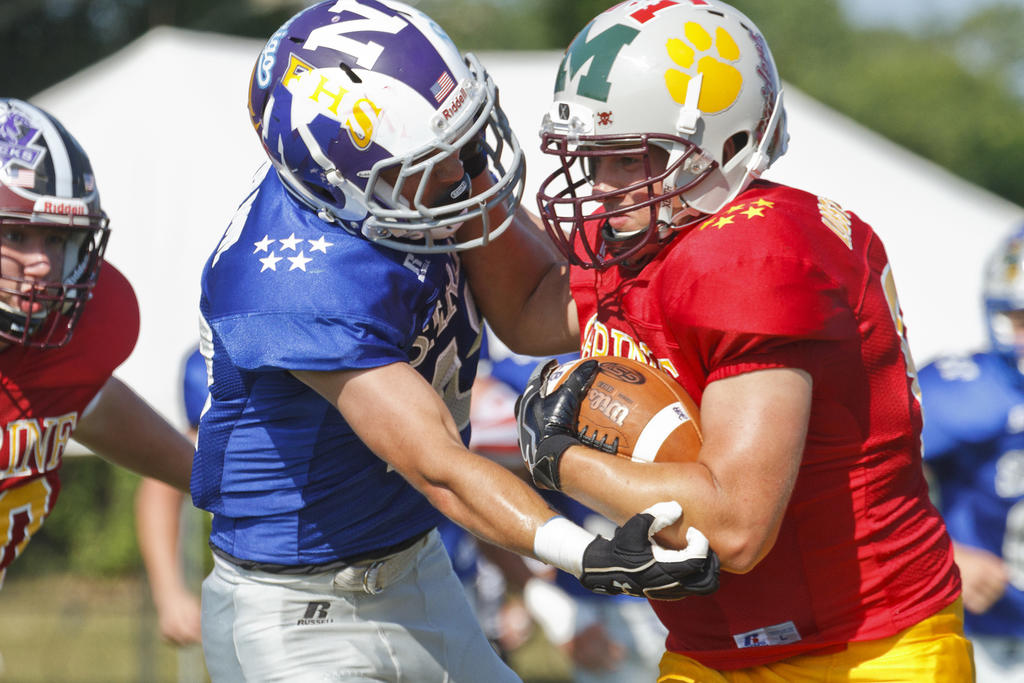 Portland running back Dylan Bolduc tries to catch a toss from the East’s quarterback. Bolduc, a Fitzpatrick Trophy finalist, was held to 30 yards on 12 carries.