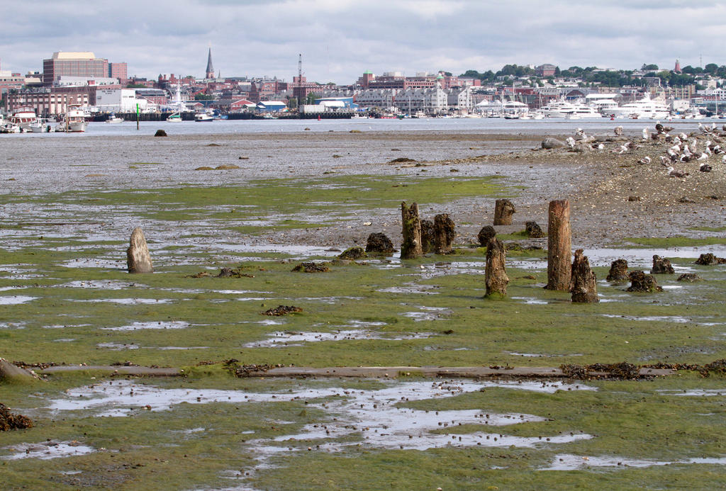 With Portland in the background, algae coats Mill Cove in South Portland during low tide on July 14. Friends of Casco Bay is monitoring the growth and three others in South Portland, Portland and Harpswell. Other blooms have been reported and the organization will be visiting the areas to investigate.