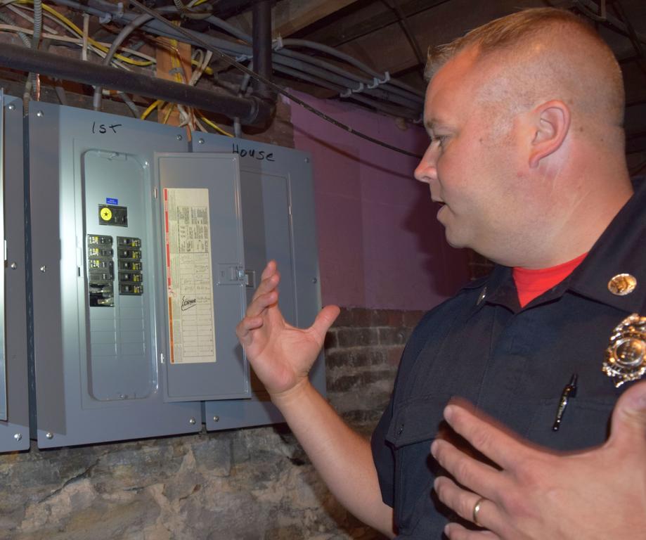 Portland Fire Department Capt. John Brennan points out circuit breaker gaps that need plugging during an apartment building safety inspection July 13 on Munjoy Hill.