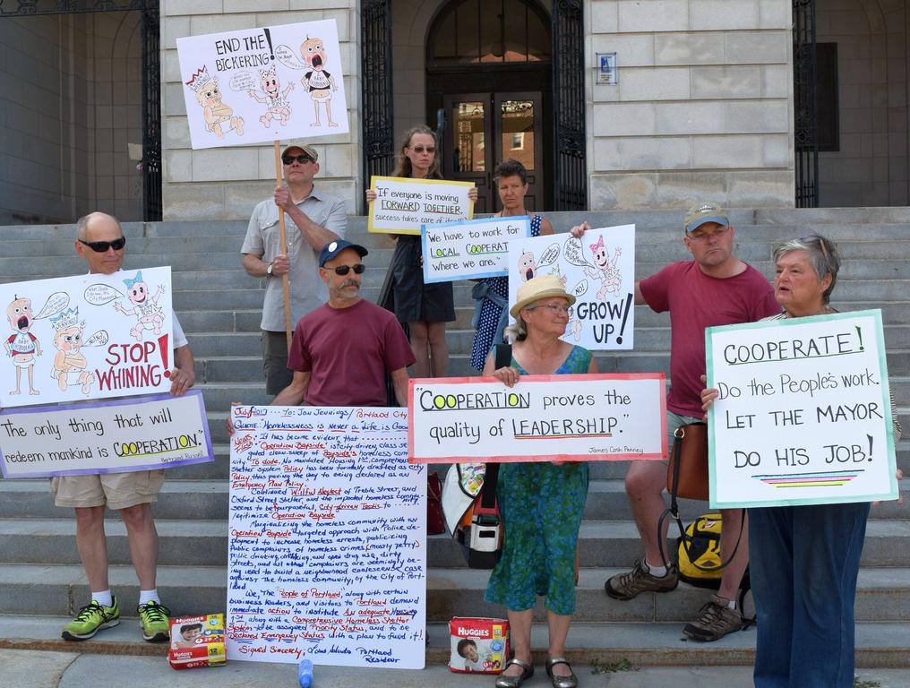 Outside City Hall, a rally organized by Progressive Portland to “defend the office of the elected mayor” drew fewer than a dozen people.