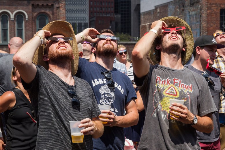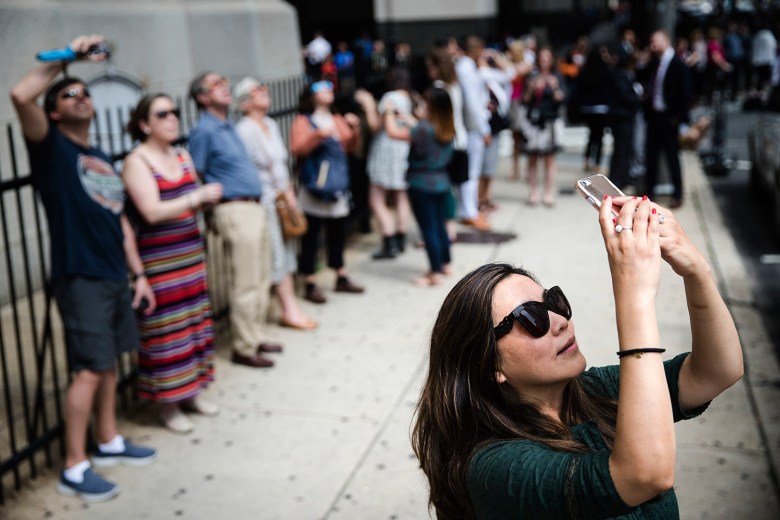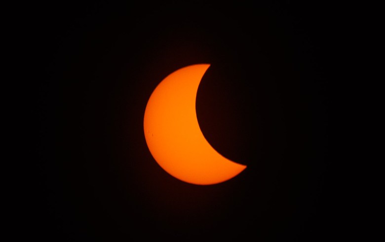 The crowd in the square let out a cheer at 2:45 p.m., when the eclipse peaked at 58.8 percent coverage. A crescent of the sun still shone through and it didn’t seem noticeably darker outdoors.