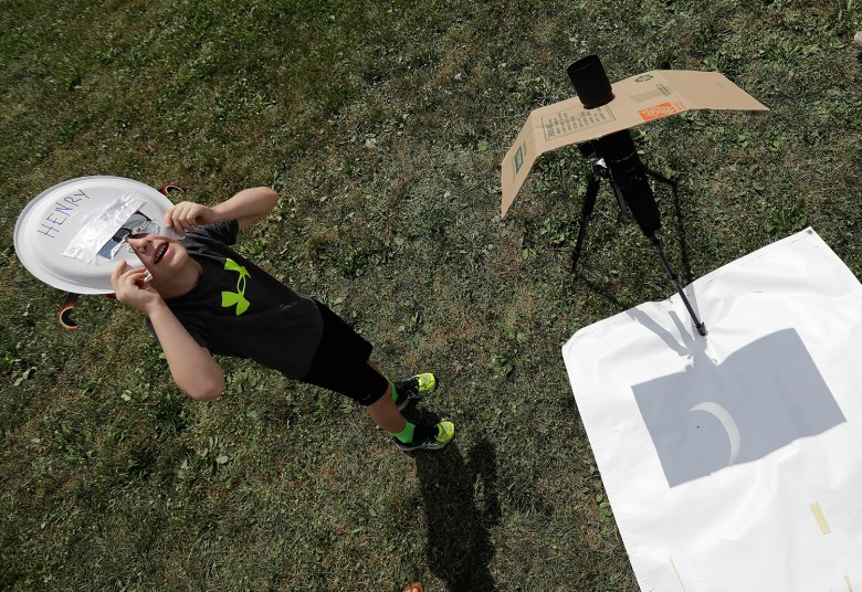 Some brought makeshift pinhole cameras made out of cardboard boxes and aluminum foil that got mixed reviews. But many in Monument Square agreed that Nate Morse, a 56-year-old amateur astronomer from Yarmouth, had the best rig.