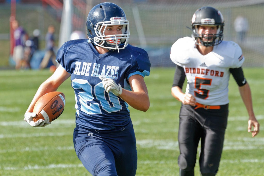 Kyle Champagne carries for Westbrook in a narrow, spectacular bout vs. Biddeford last year. Champagne will play a critical role for the Blazes this autumn as well.