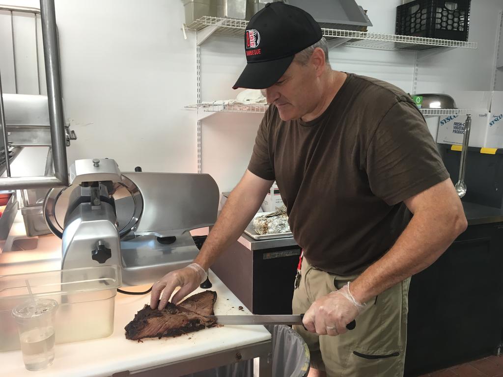 Co-owner Tim Kelly slices brisket in the kitchen of a new barbecue restaurant, B-Side Barbecue, at 107 Pleasant St. in Brunswick.