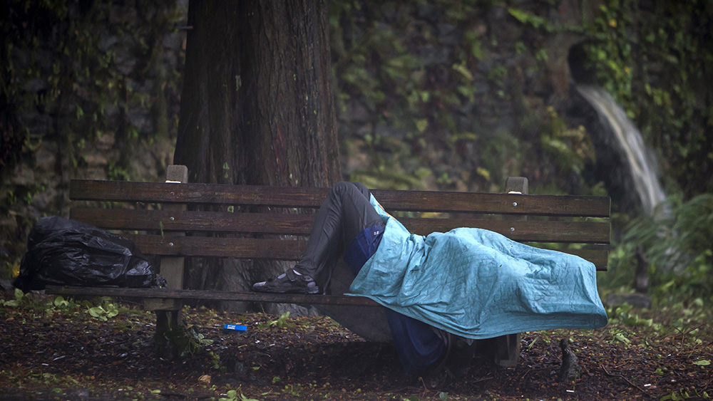 A homeless man lies on a bench on Historic River Street in Savannah, Georgia, Monday, as now-Tropical Storm Irma started to impact the area.