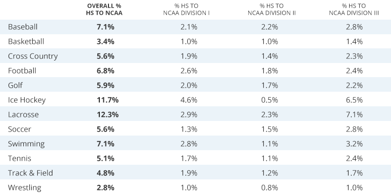 Ice hockey tops the list, with 10 percent of U.S. female players and 5.1 percent of male players landing scholarships. Lacrosse (6.4 percent of females, 5.2 percent of males) was next on the list, followed by baseball (4.3 percent) and field hockey (4.2 percent).