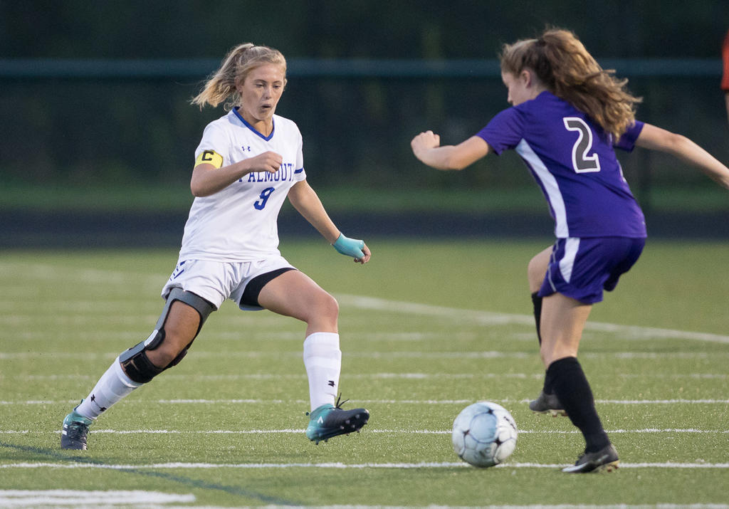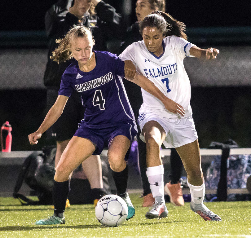 Falmouth senior Amelia Waite plays the ball down up the sideline as Marshwood freshman Natalie Singer tries to keep pace.