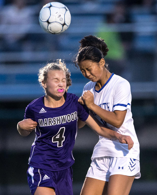 Falmouth sophomore Kelly Yoon and Marshwood freshman Ella Nelson meet in the air.