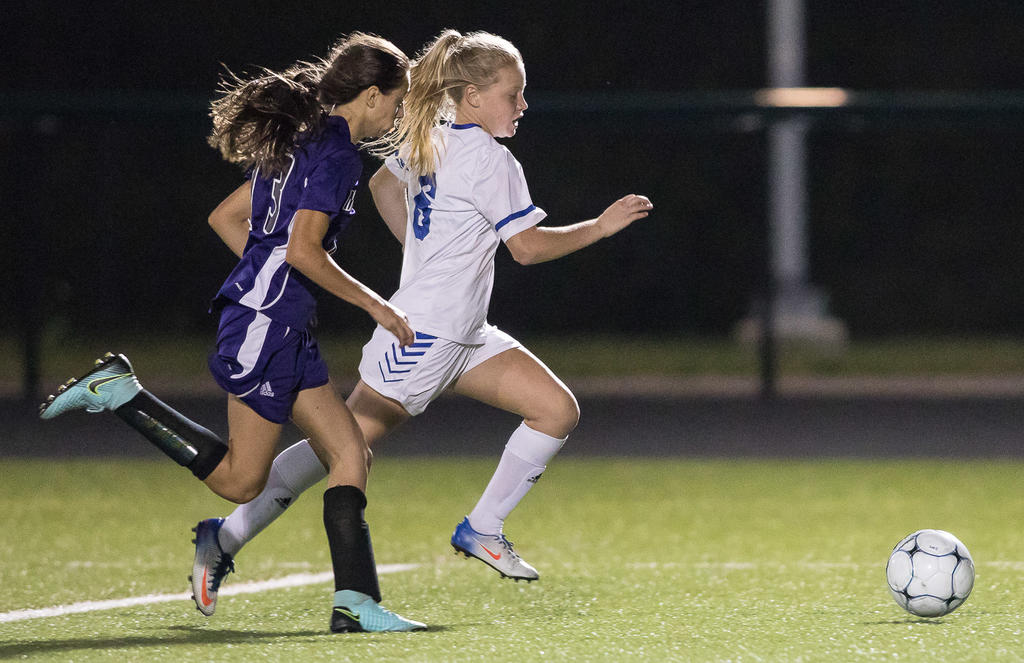 Falmouth freshman Allie Cunningham and Marshwood freshman Carmela Kriz chase the ball.