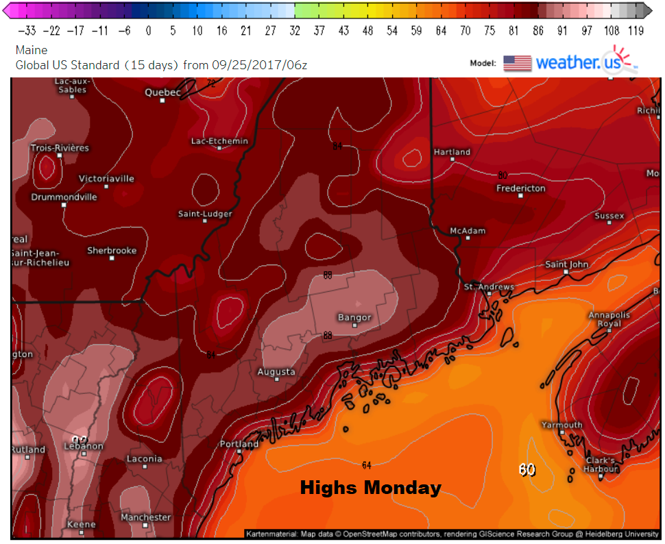 A few spots around the Augusta to Bangor region might nudge 90 this afternoon, this will be the warmest day of this stretch and likely the warmest we’ll experience until next spring and summer. As we get into October, the lower sun angle makes it quite difficult to achieve high temperatures like these.