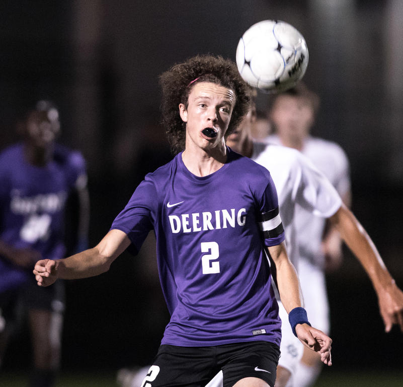 Deering senior Caleb Delano gets his head on the ball.